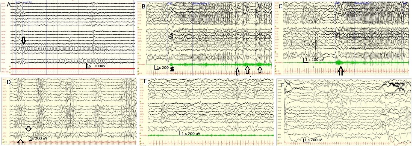 Figure 2. Different interictal and ictal patterns in ASS and neonatal epilepsy. A) Discontinuous background and focal electrographic seizures with C4 onset (see arrow) in a 40-week patient with HIE. B) Synchronous onset of high-amplitude slow waves followed by generalized rhythmic alpha activity associated with an epileptic spasm (arrow) in a patient with STXBP1-DEE. C) Sequential seizure spasm followed by brief tonic seizures ending with multifocal clonic jerks. Initially, a brief diamond-shaped myogenic artifact (arrowhead) was observed, followed by myoclonic and clonic jerks (see arrows) in a patient with KCNQ2-DEE. D, E, and F show the Burst -Suppression pattern during sleep (E, see arrows) and multifocal epileptiform discharges (D, F) and disappearance of the BS pattern in a patient with early onset Myoclonic Epileptic Encephalopathy.