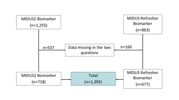 In the MIDUS 2 (n = 1,255) and MIDUS refresher biomarker projects (n=863), 537 and 160 participants, respectively had missing responses to the questions above. The final sample included 1,395 participants (Figure 1).