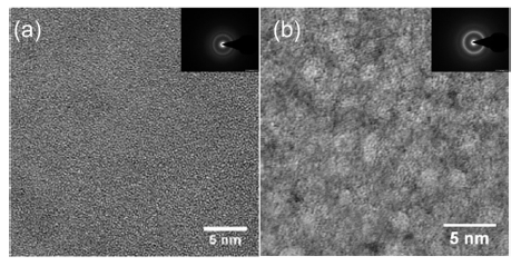 Figure 1. TEM images of (a) Zr64Ni10Al7Cu19 and (b) Zr55.7Ni10Al7Cu19Co8.3 metallic glass samples
