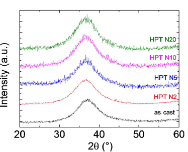 Figure 2. XRD patterns of the as-cast and HPT-treated (rotation number N=2, 5, 10, 20) Zr55.7Ni10Al7Cu19Co8.3 samples. Reprinted from [2], with the license “CC-BY 4.0” (https://creativecommons.org/licenses/by/4.0/)