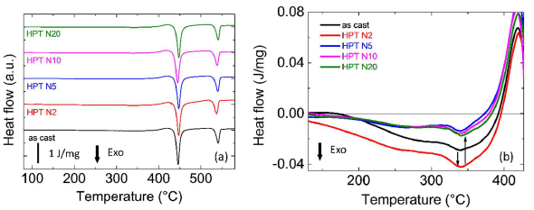 Figure 4. (a) Di fferential scan calorimetry curves of as-cast and HPT-treated (rotation number N=2, 5, 10, 20) Zr55.7Ni10Al7Cu19Co8.3 samples.(b) Relaxation energy release prior to Tg of as-cast and HPT-treated Zr55.7Ni10Al7Cu19Co8.3 samples. Reprinted from [2], with the license “CC-BY 4.0” (https://creativecommons.org/licenses/by/4.0/).