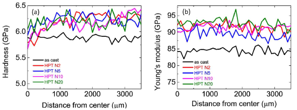 Figure 5 (a) shows the radial distributions of the nanoindentation hardness values of the as-cast state and HPTtreated (N=2, 5, 10, 20) Zr55.7Ni10Al7Cu19Co8.3 samples. In the central region (0-500 μm from the center), there is a relatively small increase of the hardness after HPT treatments of about 3%. In the outer region (500-3500 μm from the center), the hardness of the treated sample increases from 5.9 ± 0.1 to 6.3 ± 0.1 GPa. As reported in [18], the residual compressive stress is aligned parallel to the radial direction introduced by the disk material flow during HPT deformation [21]. The Young’s modulus radial distributions of the as-cast and HPT-treated Zr55.7Ni10Al7Cu19Co8.3 samples are shown in Figure 5b. After HPT treatment, the Young’s modulus of the nanoglass increases from 84 ± 2 to 92 ± 2 GPa, i.e. about 10% [22].