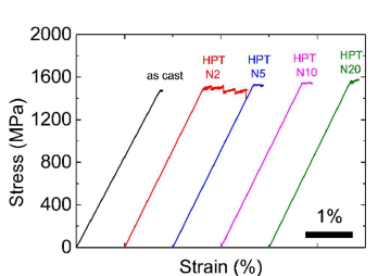 Figure 6. Tensile stress–strain curves of Zr55.7Ni10Al7Cu19Co8.3 samples before and after the HPT process (rotation number N = 2, 5, 10, 20).Modified from [2], with the license “CC-BY 4.0” (https://creativecommons.org/licenses/by/4.0/).