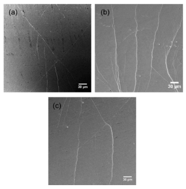 Figure 7. Shear bands on the surface of the Zr55.7Ni10Al7Cu19Co8.3 sample (a) as-cast, (b) N = 2, and (c) N = 20, under yielding load. Modified from [2], with the license “CC-BY 4.0” (https://creativecommons.org/licenses/by/4.0/).