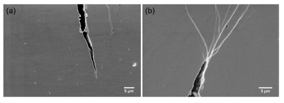 Figure 8. SEM images of crack tips during tensile tests of the deformed samples (a) Zr64Ni10Al7Cu19 and (b) Zr55.7Ni10Al7Cu19Co8.3 by HPT for two rotations. Modified from [2], with the license “CC-BY 4.0” (https://creativecommons.org/licenses/by/4.0/).