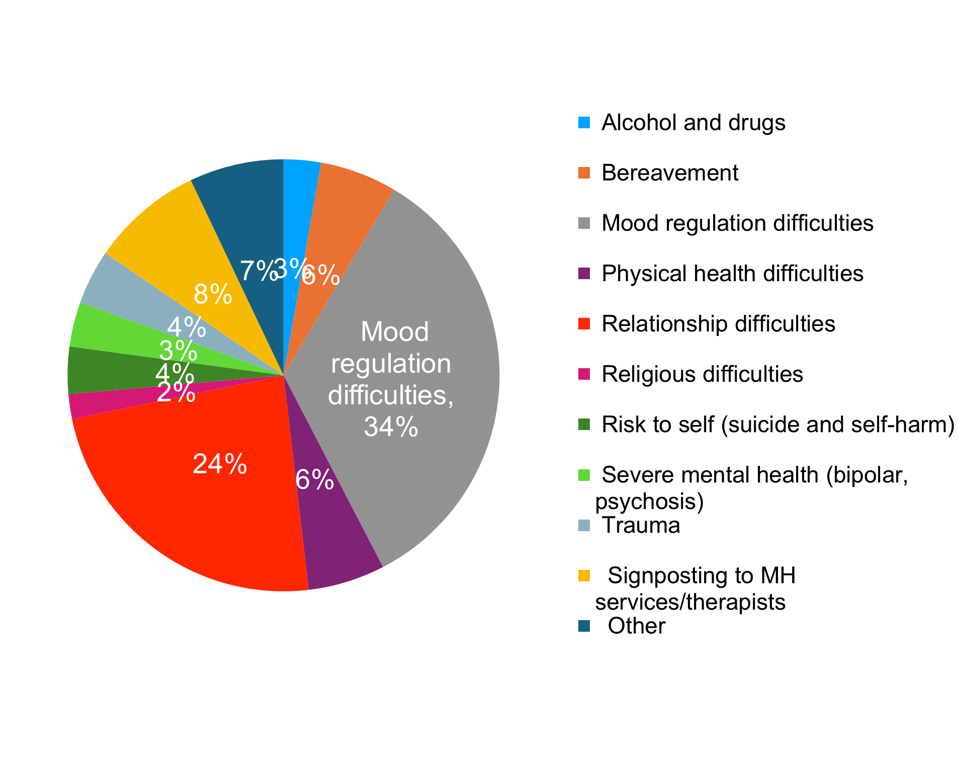 The most common presenting issue was mood regulation difficulties (33.8%), followed by relationship difficulties (23.6%). Interestingly religious difficulties (2%) and alcohol and drugs (3%) were the least common reasons for calling the helpline.