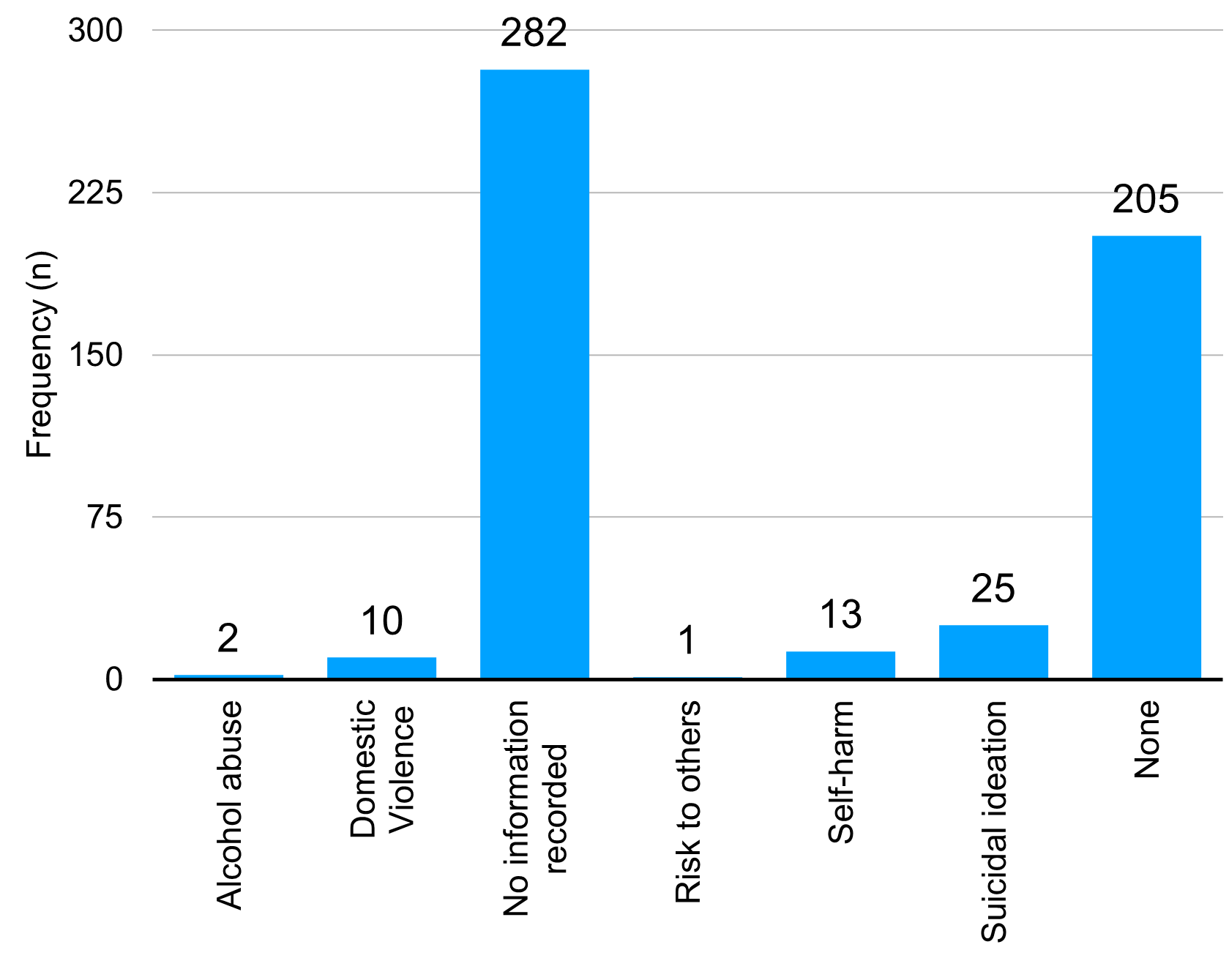 Safeguarding involves protecting individuals from harm, abuse, or neglect, particularly those who are vulnerable. It includes identifying risks and taking steps to ensure their safety. The safeguarding data indicates that more than half of the records (52.4%) had no information recorded. Among the remaining cases, the most frequently reported concerns were related to suicidality (4.6%, n=25).