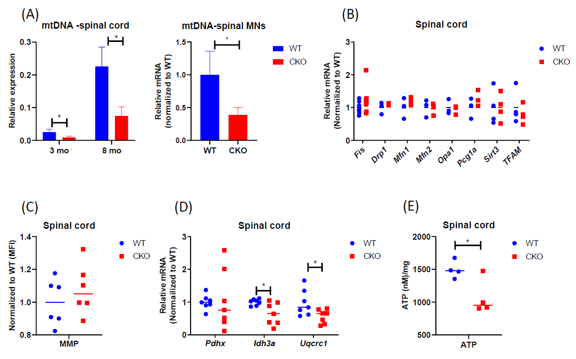 Figure 1. Mitochondrial content and metabolism are impaired in CKO spinal cord. (A) qPCR to determine mtDNA contents. mtDNA was determined by monitoring COll expression and normalized to β-actin. CKO’s spinal MNs value was normalized to that of WT. n=3. Error bars show means ± SD. (B) qPCR to determine the expression of genes for mitochondrial biogenesis in spinal cord tissues. GAPDH or RPL19 was used as an internal control, and data were normalized to WT. n=3-7 (C) Mitochondrial membrane potential (MMP). Cells from spinal cord tissues were incubated with 0.1 μM MitoTracker Deep Red at 37°C for 30 min and analyzed by flow cytometry. Cells were gated based on single and live cells (propidium iodide-). Results were normalized to WT. The n=6, pooled results were from three independent experiments. MFI = Mean fluorescence intensity. (D) qPCR to determine the expression of mitochondrial metabolic genes in spinal cord tissues. Normalized to RPL19 as an internal control, and data were normalized to WT. n=7. (E) ATP levels were detected by luminescent. n=4. Student's t-test, *p<0.05.