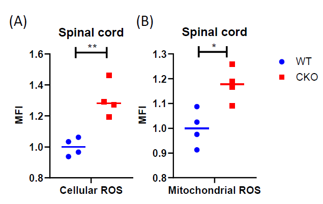 Finally, autophagy is a crucial process that maintains cell homeostasis by degrading damaged organelles. Mitophagy process selectively removes damaged or excessive mitochondria, which is typically triggered by damaged mitochondria that lose their membrane potential. Given that MMP was similar between WT and CKO's spinal cord tissues, mitophagy is most likely not affected in CKO's spinal cord. However, autophagy can be rapidly activated in response to ROS or aggregates of misfolded proteins [52,53]. Since ROS levels and unfolded protein load were both elevated in CKO spinal tissues, whether autophagy is affected in CKO would present another interesting direction to investigate in the future.