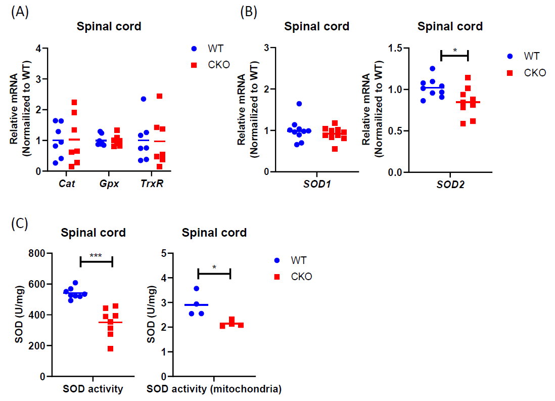 Figure 3. Antioxidant pathway is impaired in CKO spinal cord. (A) qPCR to determine the expression of ROS scavenger genes in spinal cord tissues. RPL19 served as an internal control, and data were normalized to WT. n=7. (B) qPCR to determine SOD expression in spinal cord tissues. RPL19 served as an internal control, and data were normalized to WT. n=9-10. (C) SOD activities were detected in spinal cord tissues by colorimetric. Total cellular activity, n=7, mitochondrial activity, n=4. Student's t-test, *p<0.05, **p<0.01, *** p<0.001.