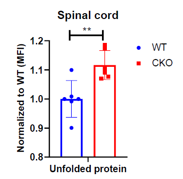 Figure 4. CRABP1 can modulate unfolded protein load in spinal cord. Cells from spinal cord tissues were incubated with 50 μM TPE-MI at 37°C for 30 min and analyzed by flow cytometry. Cells were gated based on single and live cells (propidium iodide-). Data were normalized to WT. n=6, pooled results were from three independent experiments. Error bars show means ± SD. Student’s t-test, **p<0.01. MFI = Mean fluorescence intensity.