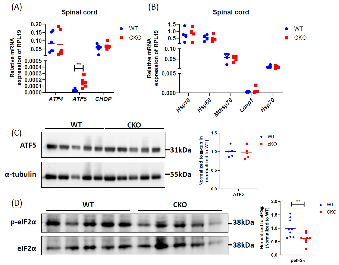 Figure 5. CRABP1 deficiency impairs UPRmt in spinal cord. (A) qPCR to determine the expression of UPRmt transcription factors in spinal cord tissues. RPL19 served as an internal control. n=6. (B) qPCR to determine the expression UPRmt genes in spinal cord tissues. RPL19 served as an internal control. n=6. (C) Left: Western blots to examine ATF5 protein expression in spinal cord tissues of WT and CKO mice. Right: Western blot quantification. Total α-tubulin was used as the loading controls. n=5. Data were normalized to WT. (D) Left: Western blots of spinal cord tissues harvested from WT and CKO mice to detect the levels of p-eIF2α. Right: quantification of peIF2α levels. Total eIF2α levels served as the loading controls. Data were normalized to WT. Results were obtained from two independent blots. n=9. Student’s t-test, **p<0.01.