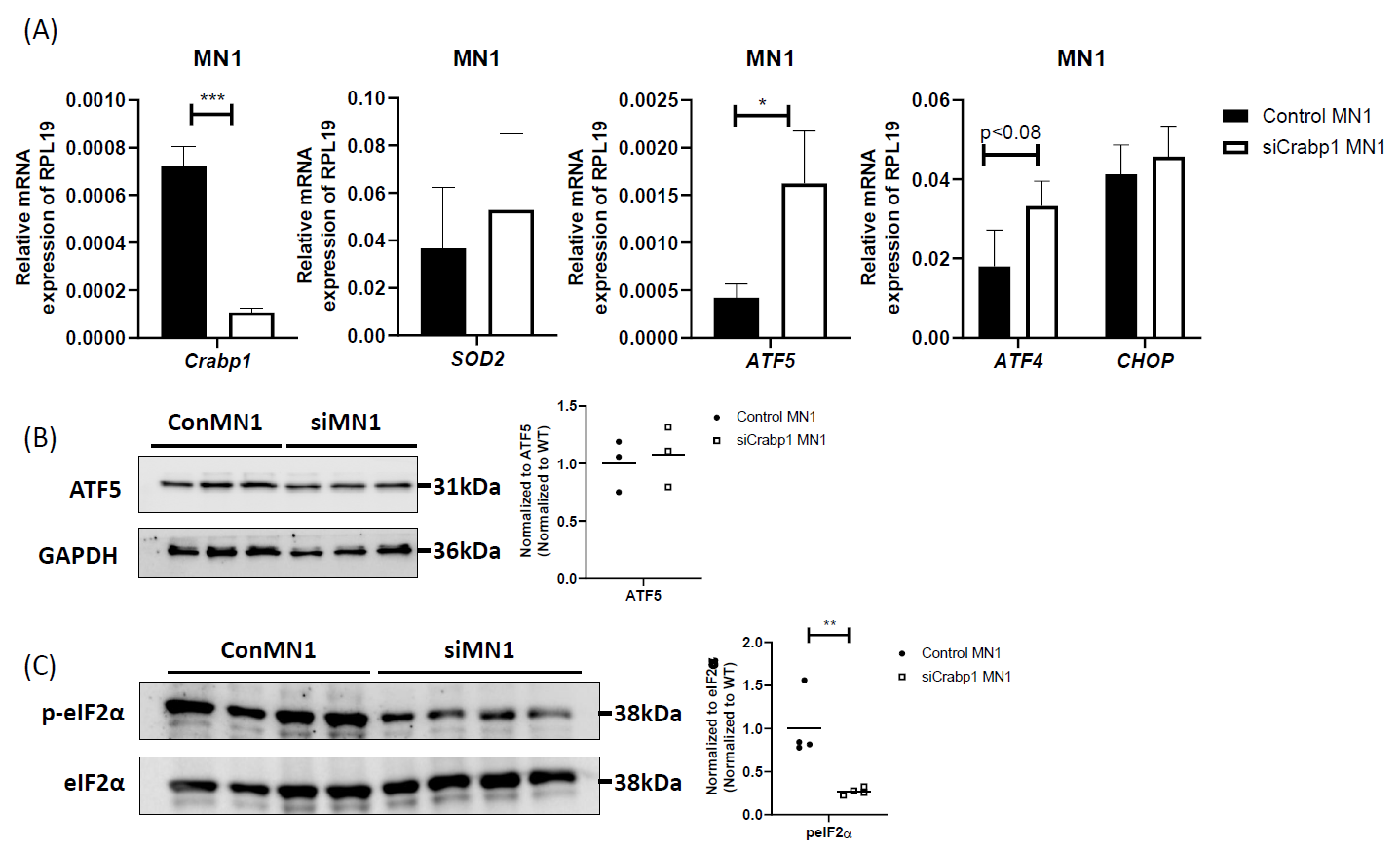 Figure 6. Cell-autonomous function of CRABP1 in modulating UPRmt in MNs. (A) qPCR to determine the expression of Crabp1, ATF5, ATF4, CHOP, and SOD2 in WT and siCRABP1-MN1 cells. RPL19 served as an internal control. Error bars show means ± SD. (B) Left: Western blots to determine ATF5 protein levels. Right: quantification of ATF4 levels with total GAPDH as loading controls. Data were normalized to WT. (C) Left: Western blots to determine p-eIF2α protein levels. Right: quantification of peIF2α levels, with total eIF2α serving as loading controls. Data were normalized to WT. Results were obtained from two independent experiments.