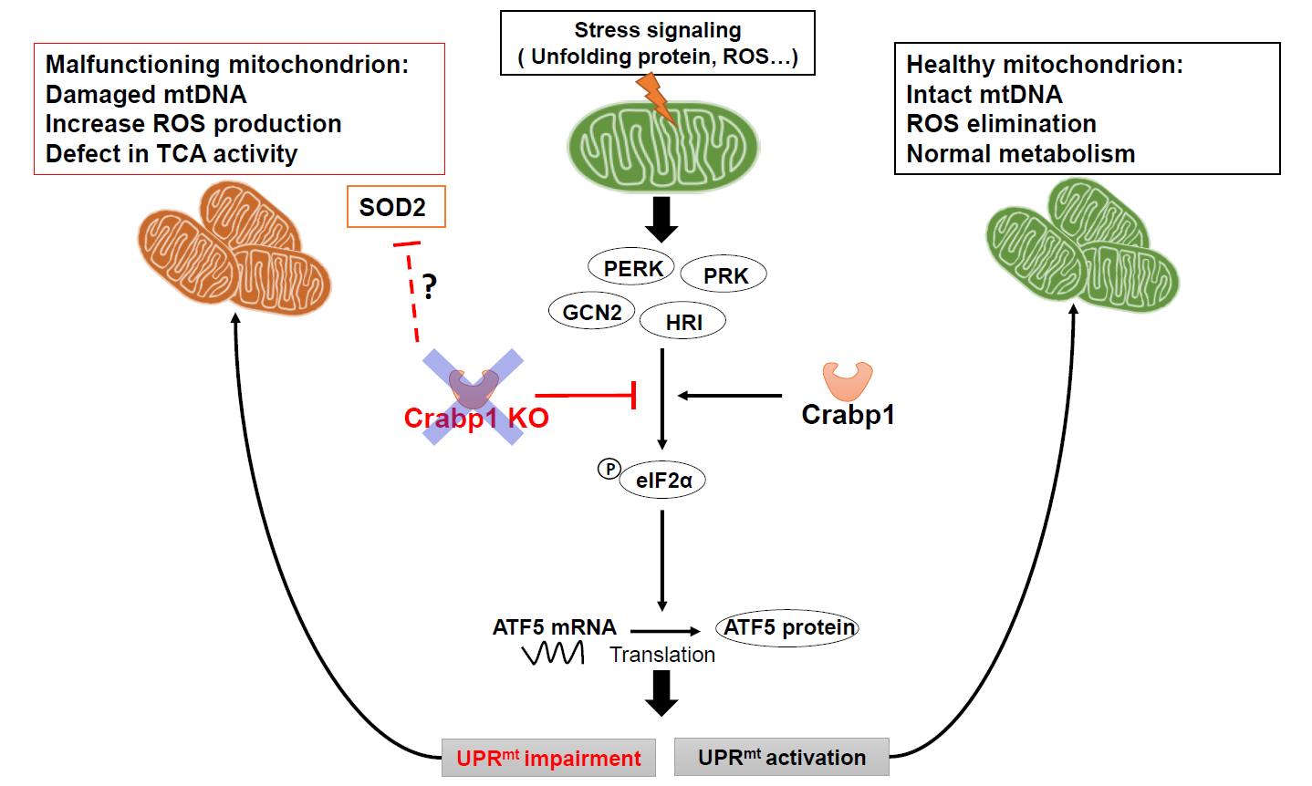 Figure 7. A model for CRABP1’s functional role in maintaining mitochondrial homeostasis. CRABP1 plays a role in maintaining mitochondrial homeostasis by regulating eIF2α phosphorylation for subsequent translational regulation of ATF5, thereby modulating the execution of UPRmt. The effect on antioxidant pathway, such as SOD2, in CKO mice could be caused by physiological compensation in whole animals.