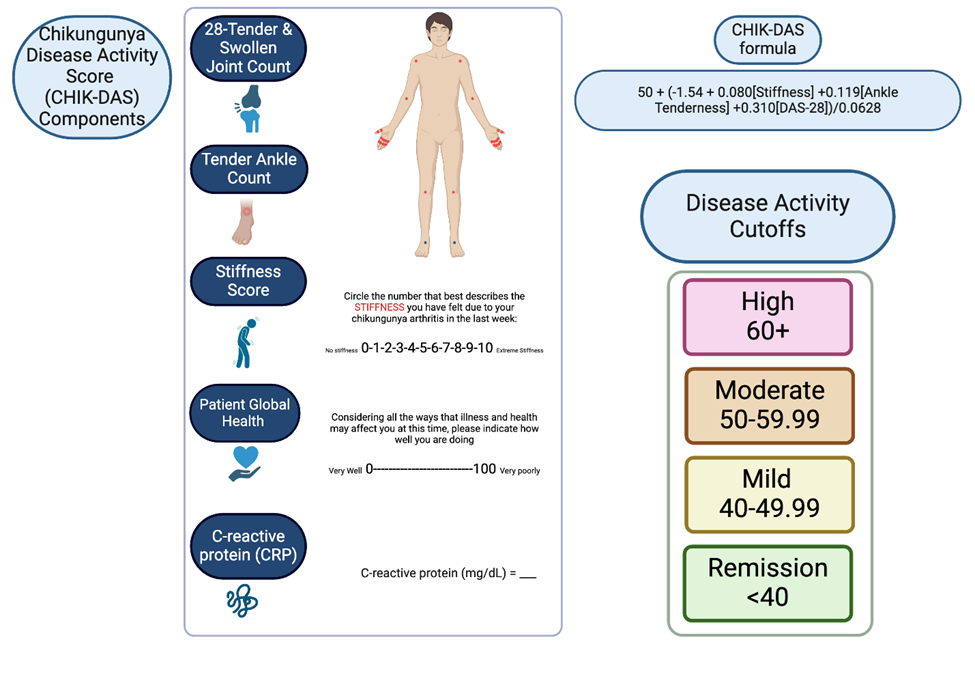 Figure 1: Chikungunya Disease Activity Score (CHIK-DAS). The items include the DAS-28 with CRP that includes a patient global health measure, ankle tenderness and a stiffness score. The 28 joints included in the DAS-28 are the bilateral shoulders, elbows, wrists, metacarpophalangeal, proximal interphalangeal and knees. The formula and scoring for the disease activity cutoffs are shown. Created with BioRender.com.