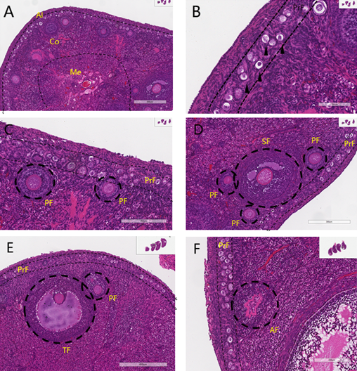 The ovarian structure of New Zealand rabbits as previous described (REF) has 4 regions, from the surface to the center there are germinal epithelium, tunica albuginea (Al), cortex (Co), and medulla (Me) as shown in (Figure 2A). The surface germinal epithelial cells are flat or cuboidal, covered by the tunica albuginea composed of dense connective tissue. The cortex is located at the periphery of the ovary and has follicles at various developmental stages, atretic follicles, stroma, and blood vessels. Primordial follicles (PrF) and primary follicles (PF) are distributed in the superficial layer. Secondary follicles (SF) and mature follicles (TF) are predominantly located in the deeper layers of the cortex, where they are less numerous and exhibit one or more irregular, antrum-like structures within the follicular cells, all surrounded by a distinct zona pellucida. Most follicles undergo degeneration during development, forming atretic follicles (AF). The medulla is located beneath the cortex and had more elastic fibers, larger blood vessels, lymphatic vessels, and nerves.