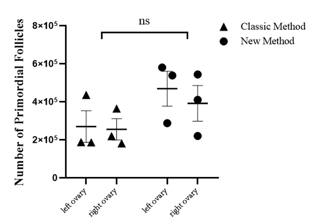 The mean and standard deviation values of the number of each stage of follicles, obtained from the direct counting method and the innovative counting method, are calculated. The results are expressed as mean ± standard error of the mean (SEM). Statistical analysis is performed using GraphPad Prism 7, and a t-test is used for comparing differences. P <0.05 is considered statistically significant, while "ns" indicates no significant difference.
