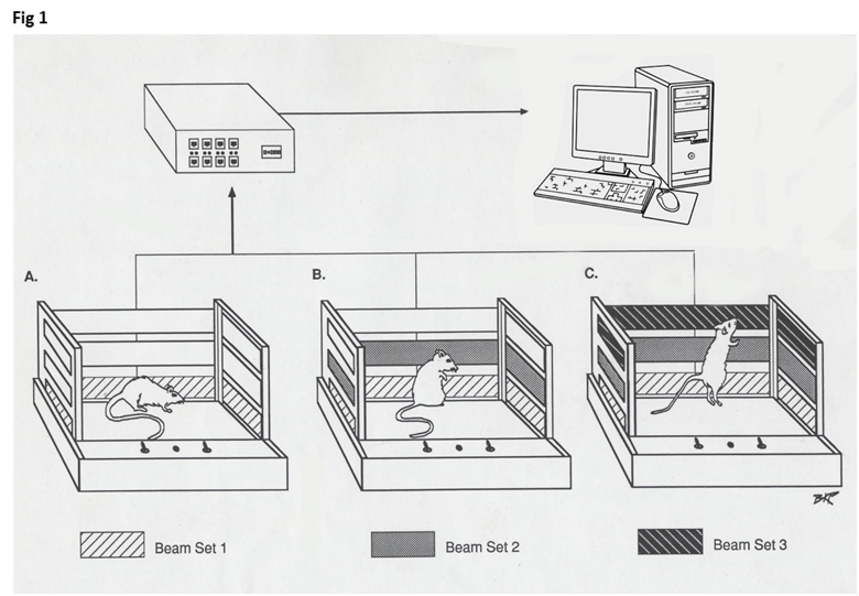 Behavioral activity was recorded in the home cage using the Computerized Animal Activity Monitoring (CAAM) system (Accuscan Instruments, Columbus, OH), which consist of an array of three levels of 8 infrared beams in each of the three levels (Figure 1). Data were collected in 10-minute bins (six bins/hour) and analyzed using OASIS software. Four locomotor indices were evaluated based on infrared beam breaks by the animals at different vertical levels: Number of movements (NM). Total distance (TD) traveled (in cm). Number of stereotypic (NOS) repetitive movements and Vertical activity (VA) as previously described [36,47–50].
