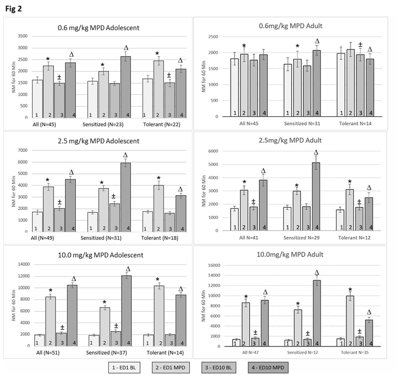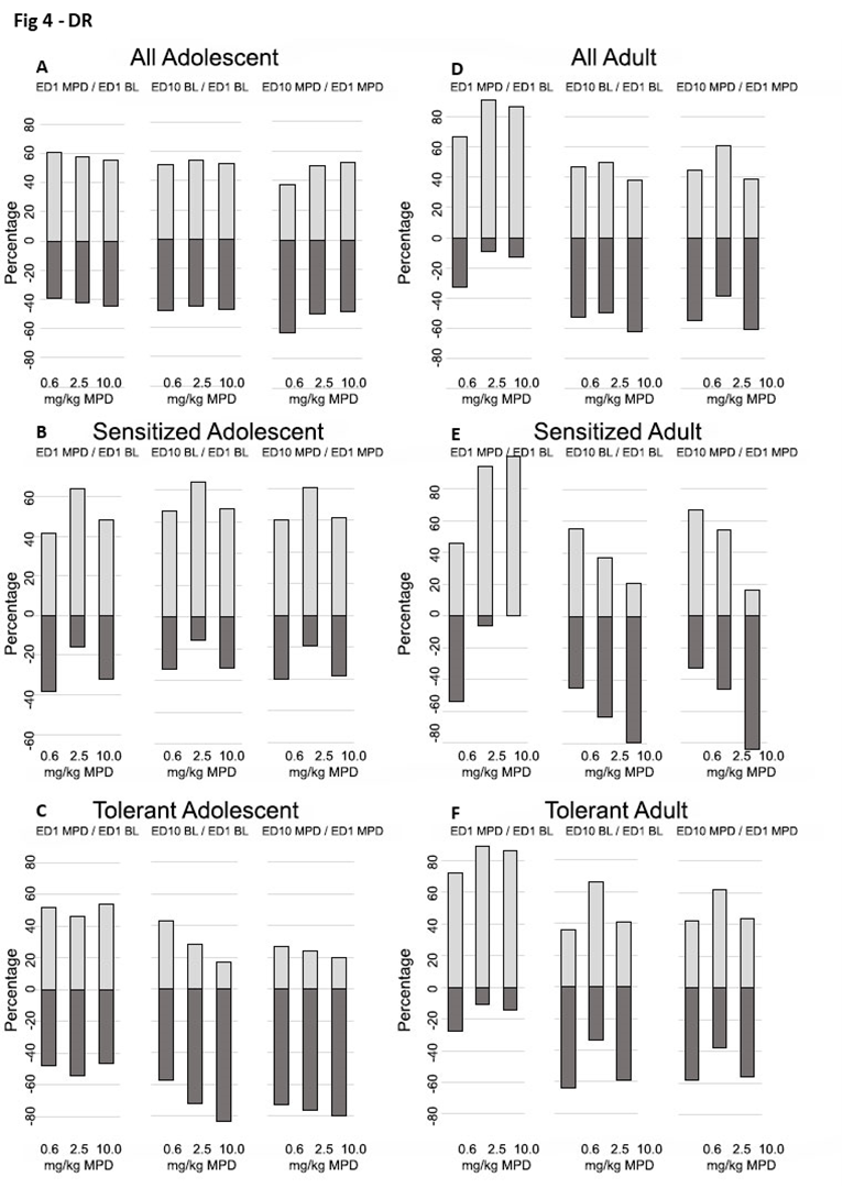 Acute MPD effects (ER1 MPD/ER1 BL): Significant increases in NM were observed in both adolescent and adult tolerant rats for all acute MPD doses (P<0.01) groups (Figure 2 – right panel).
