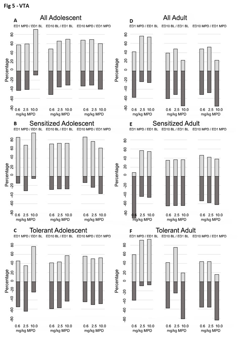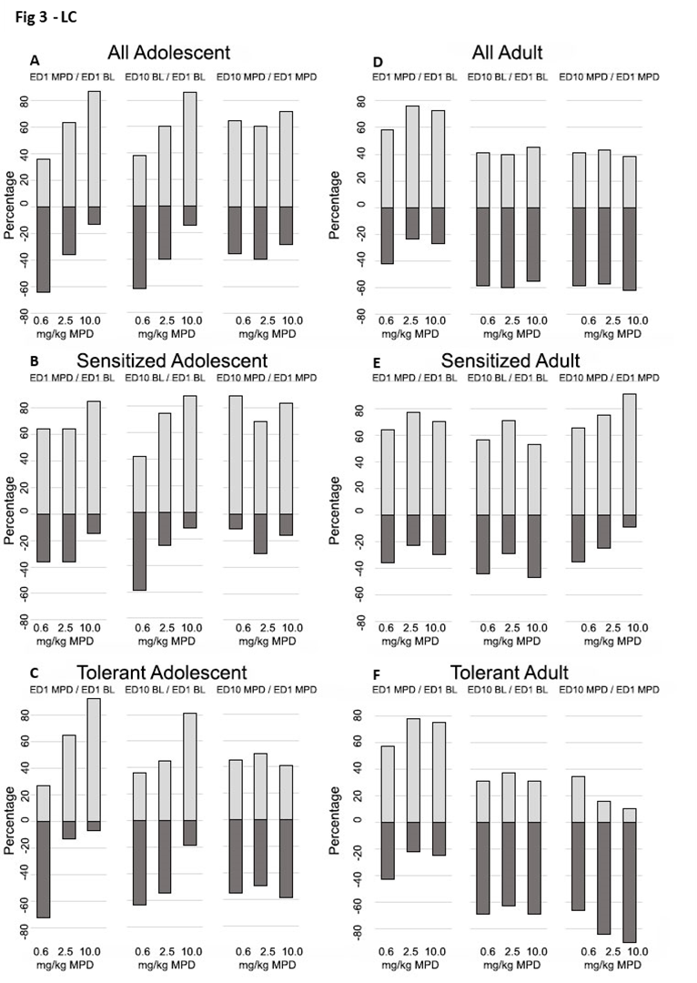The finding that MPD doses (0.6, 2.5, or 10.0 mg/kg) can lead to divergent behavioral outcomes—tolerance in some animals and sensitization in others—highlights the complexity of MPD’s action. These results underscore the importance of concurrently examining neuronal and behavioral responses during chronic MPD exposure whether the recording was obtained from animals expressing behavioral tolerance versus sensitization. Neurophysiological data confirm that the LC, DR, and VTA all participate in MPD’s effects, but each contributes uniquely. NE, 5-HT, and DA systems are differentially engaged based on MPD dose and age. Each brain region exhibited a distinct ratio of excitatory to inhibitory neurons, suggesting that the different ratio of the dual mechanism (excitation and inhibition) in the LC, DR, and the VTA underpinning region-specific outcomes.