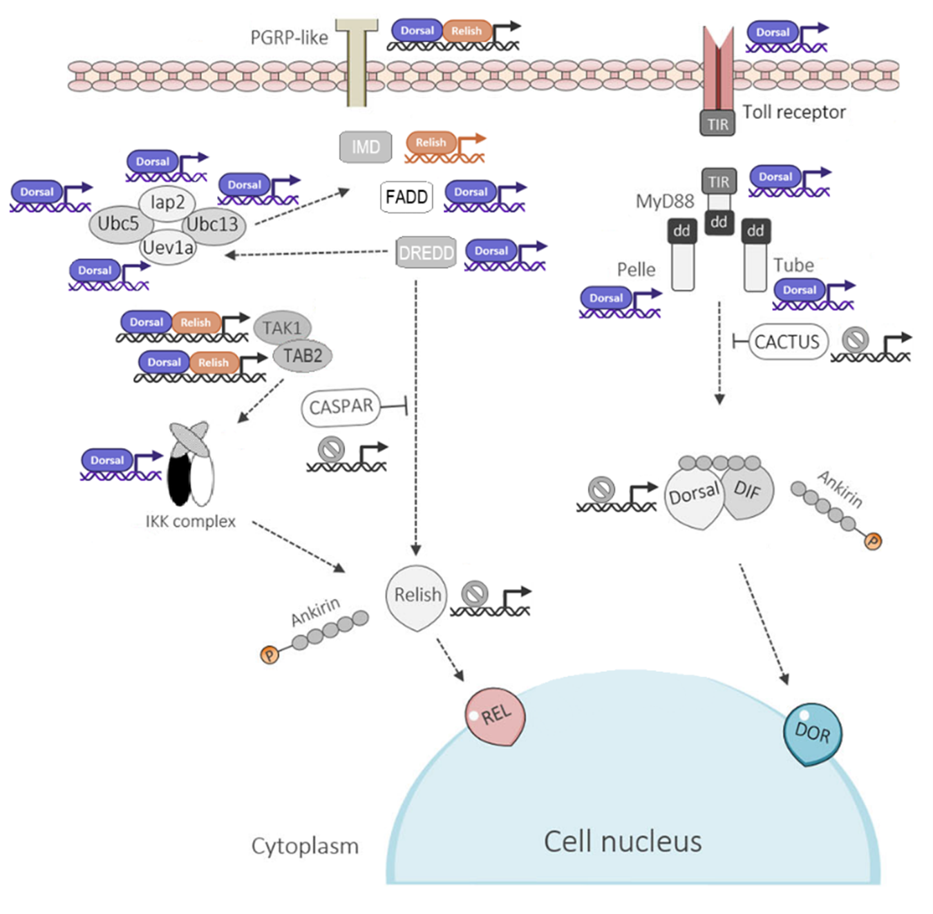 In conclusion, the functionality of the IMD pathway in hemipterans should be understood bearing in mind the possibility that unidentified IMD cascade elements could still be present as such or substituted by other molecules or alternative signaling strategies that bypass canonical IMD components. Their high variation and plasticity may reflect adaptations to species-specific immune pressures, pathogen interactions. The cross activation of the immune signaling pathways, mainly mediated by Doral/Dif transcription factors illustrates the elder evolution of this pathway and their capacity to recruit IMD a probably evolutive adaptation to broaden humoral immune responses in insects, including hemipterans.