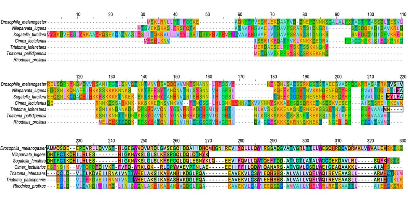 Figure 2. Multiple sequence alignment of Imd protein sequences from six hemipteran species: Nilaparvata lugens, Sogatella furcifera, Cimex lectularius, Triatoma infestans, Triatoma pallidipennis, and Rhodnius prolixus. Sequences were obtained through tBLASTn (https://blast.ncbi.nlm.nih.gov/) searches using annotated Imd proteins from the 4IN database (Innate Immunity Genes in Insects, available at: http://bf2i300.insa-lyon.fr:443/home) as queries and aligned with the canonical Imd sequence from Drosophila melanogaster. Conserved regions corresponding to the Death domain were identified using InterPro (https://www.ebi.ac.uk/interpro/) and are highlighted with black rectangles. The R. prolixus sequence lacks a detectable Death domain, indicating potential divergence or functional loss of this domain in this species..