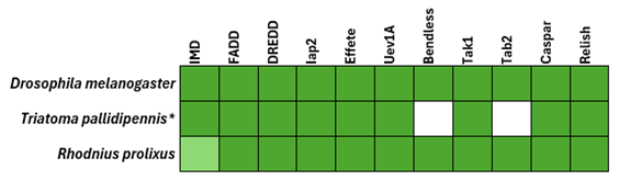 Figure 3. Comparative identification of IMD pathway components in Rhodnius prolixus and Triatoma pallidipennis. Protein sequences of IMD pathway components (Imd, FADD, DREDD, IAP2, Effete, TAK1, TAB2, Caspar, and Relish) were obtained from the 4IN database : (http://bf2i300.insa-lyon.fr:443/home) and used as queries in tBLASTn (https://blast.ncbi.nlm.nih.gov/) searches against the genome assembly of R. prolixus and a de novo assembled transcriptome of T. pallidipennis. Drosophila melanogaster is included as a model organism of the IMD signaling pathway to contextualize the findings in hemipteran insects. Presence of genes or transcripts is indicated in dark green; light green indicates the presence of the gene but lacking the representative domain (Death domain, IPR000488). An asterisk (*) denotes that a transcriptome was used as a reference instead of an annotated genome.