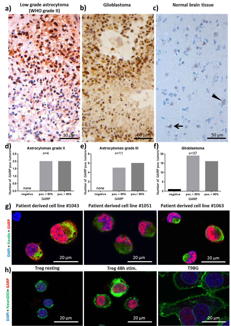 To determine in situ GARP expression, its relevance in the TME of primary brain tumors, and its comparative expression levels to astrocytomas grade II and III, 37 patients with histologically confirmed astrocytomas were recruited for this study [19]. Immunohistochemistry was performed on excised tumor tissue and stained for GARP. Notably, all astrocytomas grade II and III and GBs, except for one GB sample, exhibited high levels of GARP expression (Figure 1a, b, d, e, f). Altogether, the prevalent expression of the inhibitory molecule GARP in brain tumor tissue (Figure 1a, b, d, e, f), such as GB and lowgrade glioma, and relatively low abundance in healthy brain tissue (Figure 1c), suggest potential important roles of GARP in the immunosuppressive TME and as a biomarker.