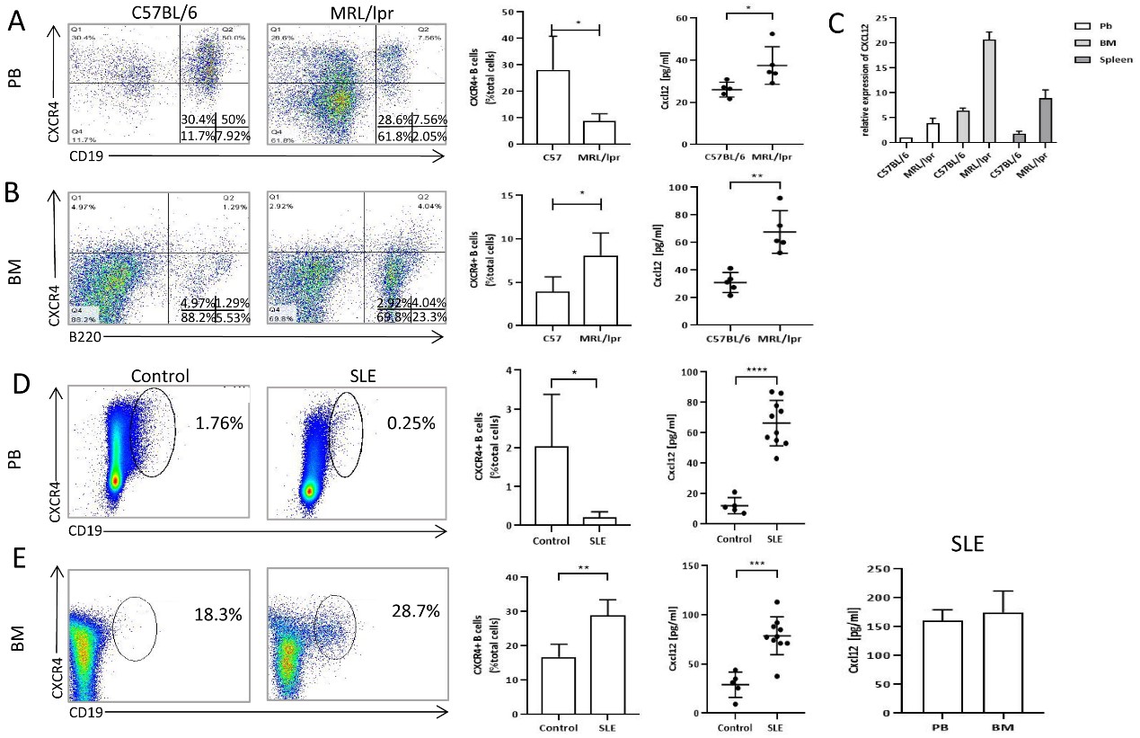 The BM of MRL/lpr mice and SLE patients exhibited an increased percentage of CXCR4+ B cells and higher levels of CXCL12