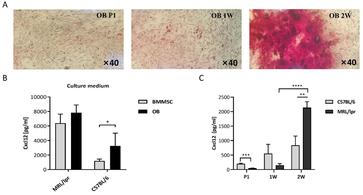 Reportedly, many types of cells in the BM stroma, including MSCs, endothelial cells and OBs, produce CXCL12 [23]. We then successfully obtained OBs from the mouse skull, and their osteogenic potential was validated by alkaline phosphatase (ALP) staining (Figure 2A). Compared to MSCs, OBs were shown to produce higher levels of CXCL12 (Figure 2B). In addition, MRL/lpr-derived OBs were also shown to produce higher levels of CXCL12 than C57-derived cells after 2w culture with osteogenic medium (Figure 2C).