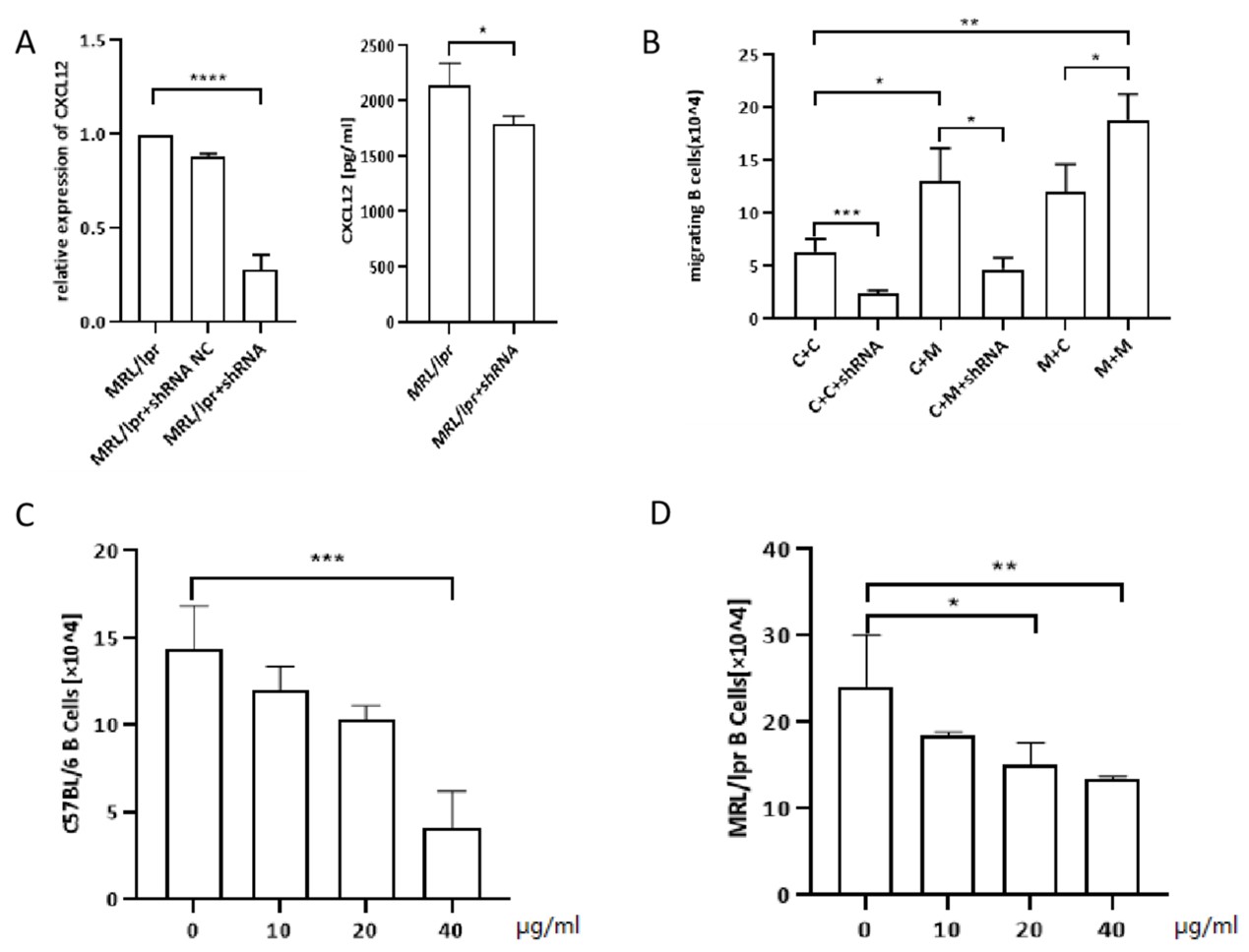 Figure 3. The number of transwell migration of B cells to OBs. A: shRNA efficiency was shown by qRT-PCR. shRNA effectively decreases supernatant concentration of CXCL12 in the OBs culture.(MPL/lpr+shRNA: MPL/lpr-derived OBs transinfected with shRNA by lentiviral vector ) B: Transwell migration of splenic B cells (upper chamber) to OBs (lower chamber): C+C: C57/BL6 mice B cells (upper chamber) + C57/BL6 mice OBs (lower chamber); C+C+shRNA: C57/BL6 mice B cells (upper chamber) + C57/BL6 mice OBs transfected with shRNA (lower chamber); C+M: C57/BL6 mice B cells (upper chamber) + MRL/lpr mice OBs (lower chamber); C+M+shRNA:C57/BL6 mice B cells (upper chamber) + MRL/lpr mice OBs transfected with shRNA (lower chamber); M+C: MRL/lpr mice B cells (upper chamber) + C57/BL6 mice OBs (lower chamber); M+M: MRL/lpr mice B cells (upper chamber) + MRL/lpr mice OBs (lower chamber). C: Number of C57-derived splenic B cells migrated to MRL/lpr-derived OBs treated with CXCL12 antagonists (LIT-927) at different concentration. D: Number of MRL/lpr-derived splenic B cells migrated to MRL/lpr-derived OBs treated with LIT-927 at different concentration. Data represented the mean± SD. *P<0.05, ** P<0.01, *** P<0.001.