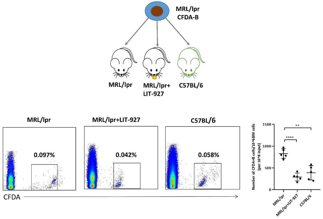 Figure 4. The number of CFDA-labeled MRL/lpr-derived B cells homing to BM. CFDA-labeled CD19+ B cells were retro-orbitally injected into 12- to 13-week-old syngenic C57BL/6 (n=5), MRL/lpr (n=5), and LIT-927 treated MRL/lpr (n=5), respectively. The percentage of CFDA-labeled B cells in the bone marrow was analyzed 24 hours later post-injection by flow cytometry. Data represented the mean ± SD. ** P<0.01, **** P<0.0001.