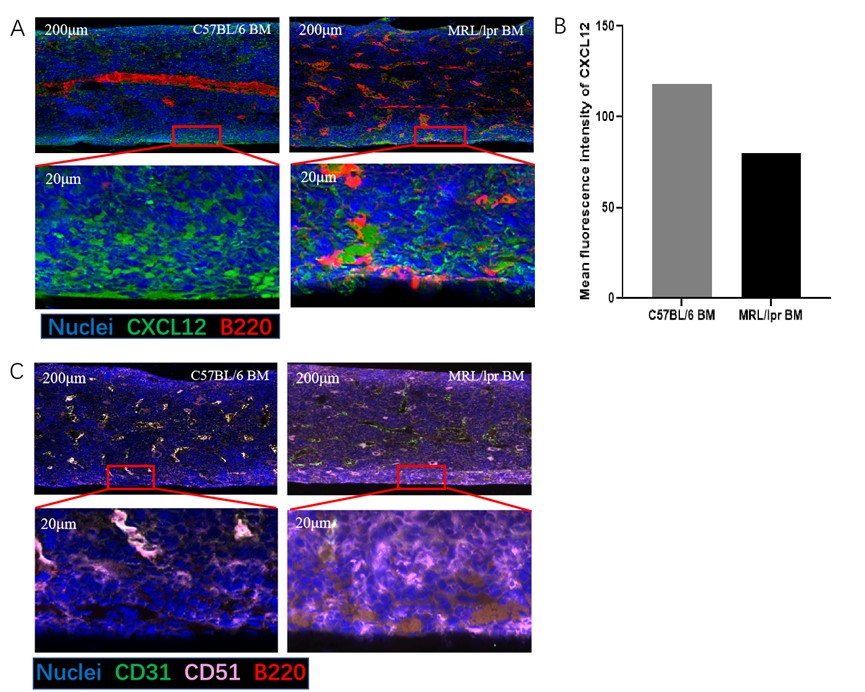 In summary, our study implies that the abnormal CXCR4/CXCL12 axis is associated with a shift in the distribution of B-lymphocytes between the BM and BM compartments in an SLE mouse model. More importantly, an increasing number of B-lymphocytes were found to colocalize with CXCL12-expressing OBs in the periosteal zone. We hypothesize that dysregulated OB niches play an important role in the pathogenesis of SLE, and the clinical significance of this finding deserves further exploration.