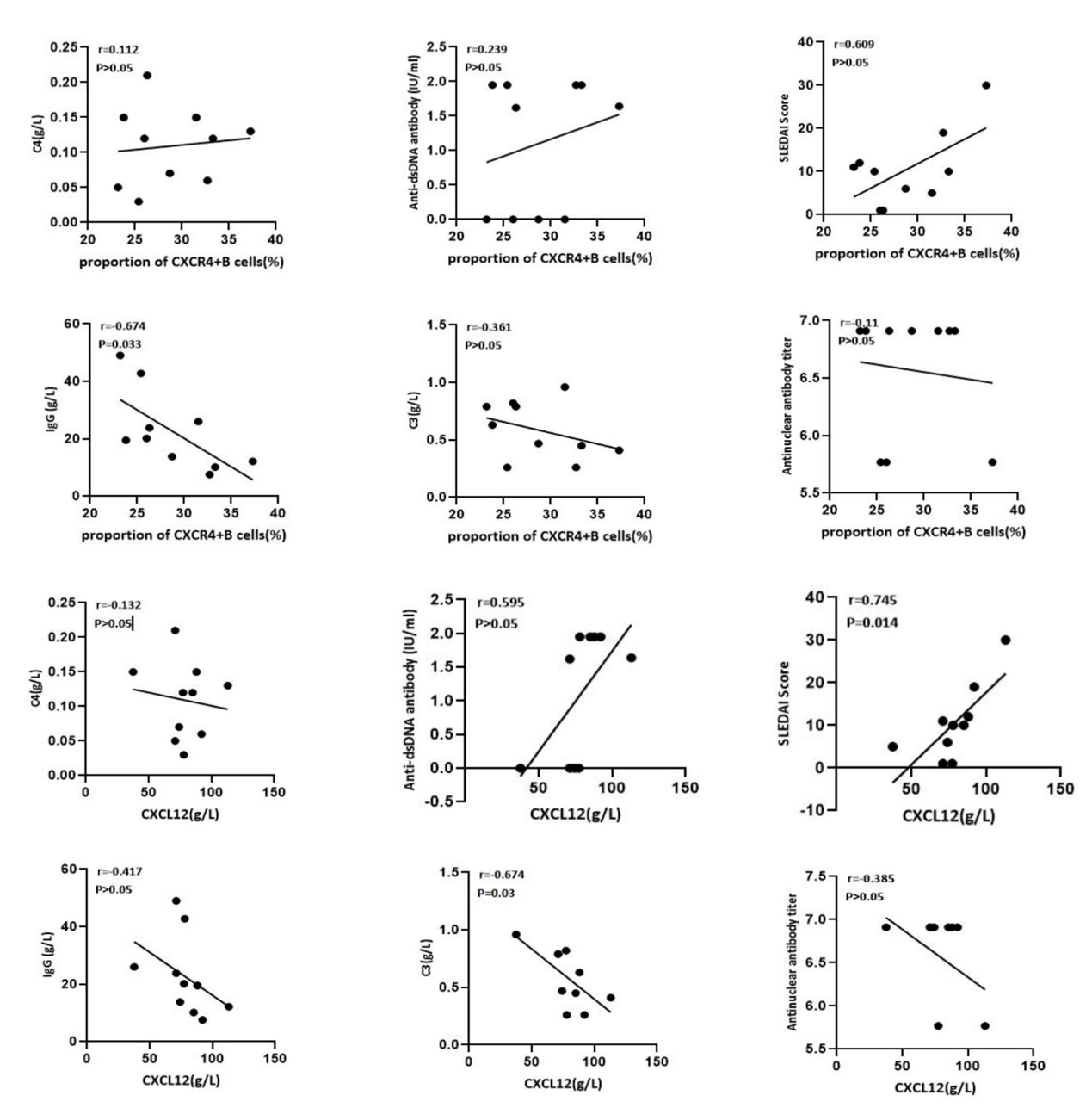 As shown in Figure 6, the percentages of CXCR4+ B cells were negatively correlated with the serum IgG concentration (r=-0.674, P<0.05). The level of CXCL12 was positively correlated with the systemic lupus erythematosus disease activity index (SLEDAI) score (r=0.745, P<0.05) and negatively correlated with the complement 3 (C3) concentration (r=-0.674, P<0.05). These clinical findings once again indicated that the abnormal BM environment characterized by increased levels of CXCR4+ B cells and CXCL12 is correlated with SLE disease activity.
