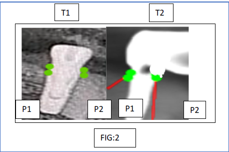 Materials and Methods: This study evaluated 10 implants from a single patient, 5 each from the maxillary and mandibular arches, with a follow-up of 12 months. Implants were assessed hinged to the load that is applied by the prosthesis mesial and distal points P1 and P2. Crestal bone loss was quantified by measuring bone level changes using cone beam computerized tomography (CBCT). Time T1 was defined as 3 months after implant placement, and T2 as the term after 12 months of implant positioning, follow-up visit. Group comparisons will be made using the Wilcoxon signed rank test, with significance set at p<0.05.