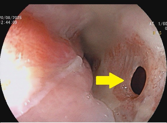 Figure 1. Endoscopic image showing ulcerated growth causing narrowing of esophageal lumen along with a small circular defect suggestive of tracheo-esophageal fistula (yellow solid arrow).