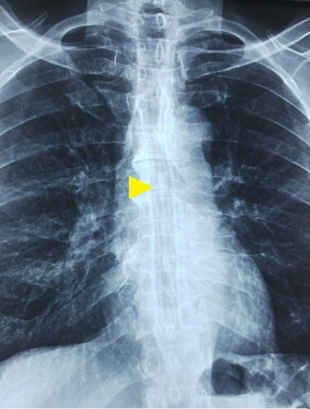 Figure 3. X-ray image showing esophageal self expanding metal stent (E-SEMS) in situ (yellow arrow head).