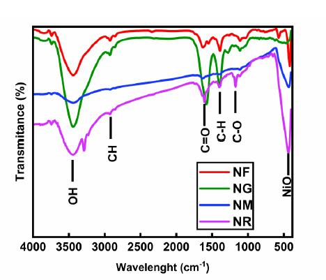 Figure 3. FTIR of NF, NG, NM, NR and NiO.
