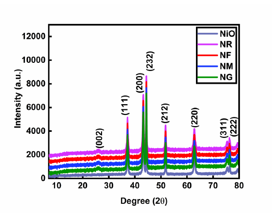 X-ray diffraction (XRD): XRD analysis (Figure 2) confirms the crystalline nature and phase purity of all NiO and NiO- based nanohybrids (NM, NG, NR, and NF). Distinct diffraction peaks at 25.75° correspond to the (002) plane of carbon materials [12,16], while peaks at 37.1°, 44.32°, 51.7°, 63.10°, 76.20°, and 79.52° are indexed to the (111), (200), (212), (220), (311), and (222) planes of cubic NiO, respectively [15]. In case of nano hybrids both carbon and NiO peaks present which verifies successful formation of NiO-carbon nanohybrids.