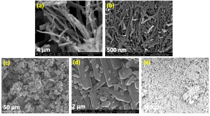 Figure 6. SEM of NiO nanotubes (a), f-MWCNT (b), RGO (c), fullerene (d) and GQD (e).