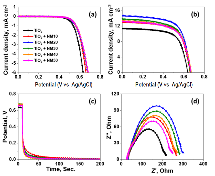 In summary, the incorporation of NM nanocomposites into NiO and TiO2 photoanodes markedly enhances the photovoltaic performance of DSSCs. These improvements stem from optimized electron transport, minimized recombination, increased dye adsorption, and favourable interfacial properties. Among all configurations, the 20% NM composite exhibited the best overall performance, validating its potential as a high-efficiency photoanode material for next-generation DSSCs.