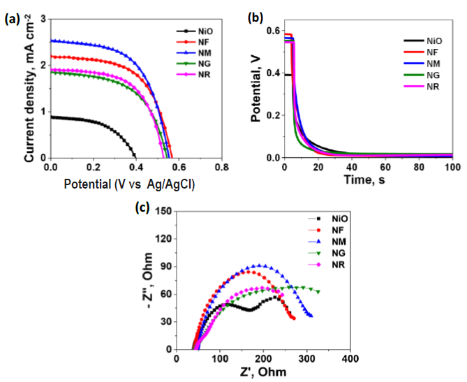 To assess the photovoltaic behavior of the synthesized NiO-based nanohybrids, DSSCs were fabricated using N719 dye as the sensitizer. Devices incorporating four distinct nanohybrids NF, NG, NM, and NR were systematically compared to a reference device based on pristine NiO. All devices employed a standard liquid-state electrolyte. The J–V characteristics under AM 1.5 illumination are shown in (Figure 7a), and the photovoltaic parameters including Jsc, Voc, fill factor FF, and PCE are compiled in (Table 1).