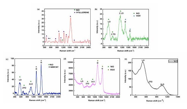 Raman spectroscopy: Raman spectra (Figure 3) exhibit characteristic D (~1,350 cm-1) and G (~1,580 cm-1) bands of carbon allotropes in all hybrids (NM, NG, NR, and NF), indicating structural defects and graphitic domains [8]. NiO-specific modes at 545, 780, and 1,094 cm-1 correspond to LO, 2TO, and 2LO phonon vibrations, respectively [15,19,21]. These combined signals confirm the coexistence of NiO and carbon phases in the nanohybrids.