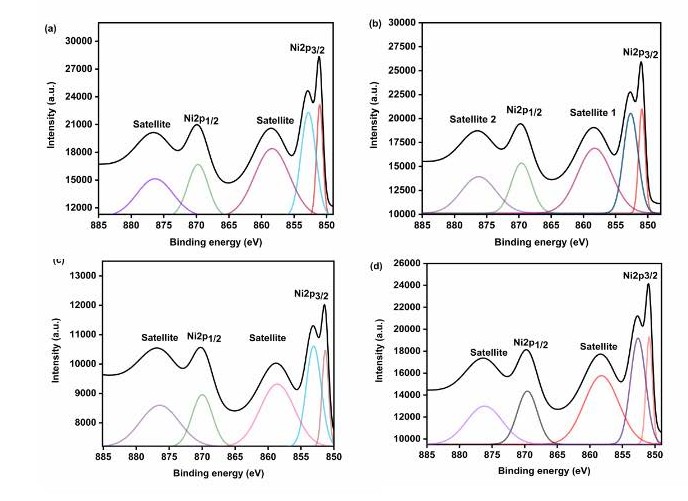 X-ray photoelectron spectroscopy (XPS): The elemental composition and oxidation states of the NF, NG, NM, and NR nanohybrids were investigated using X-ray photoelectron spectroscopy (XPS). The XPS results confirmed a similar elemental profile across all the nanohybrids. Figures 4a–4d shows the Ni 2p spectra, where distinct peaks at 851.1 and 852.8 eV correspond to the Ni 2p3/2 region, confirming the presence of Ni2+ species. A peak observed at 869.7 eV is assigned to the Ni 2p1/2 spin–orbit level, further validating the existence of NiO. Additionally, two prominent satellite peaks at 858.8 and 876.4 eV are characteristic of Ni2+ and serve as conclusive evidence for the formation of NiO shells in all nanohybrids [21].