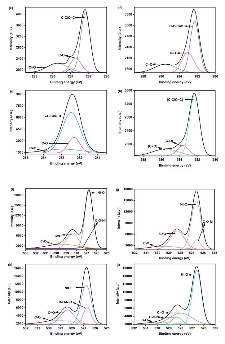 The deconvoluted C 1s spectra, displayed in (Figures 6e–6h), highlight the presence of various oxygen-containing functional groups. A dominant peak at 282.30 eV corresponds to non-oxygenated, sp²-hybridized carbon (C=C/C−C), which is typical of carbon allotropes. Additional peaks at 283.45 eV and 285.50 eV are assigned to C−O and C=O bonds, respectively, indicating surface oxygen functionalities present on the carbonaceous components [16,19,21]. (Figures 4i–4l) presents the O 1s spectra for all nanohybrids. A strong peak at 526.7 eV is attributed to lattice oxygen (O2-) in NiO. Peaks at 528.7 and 529.5 eV correspond to oxygen atoms involved in C=O and C−O bonding, respectively. The appearance of an additional peak at 527.5 eV after the integration of NiO suggests the formation of C−O−Ni linkages. Finally, (Figure 4m) provides the survey spectra of the nanohybrids, clearly showing the presence of nickel, oxygen, and carbon. These results collectively confirm the successful formation of NiO-based carbon nanohybrids with chemically bonded components.
