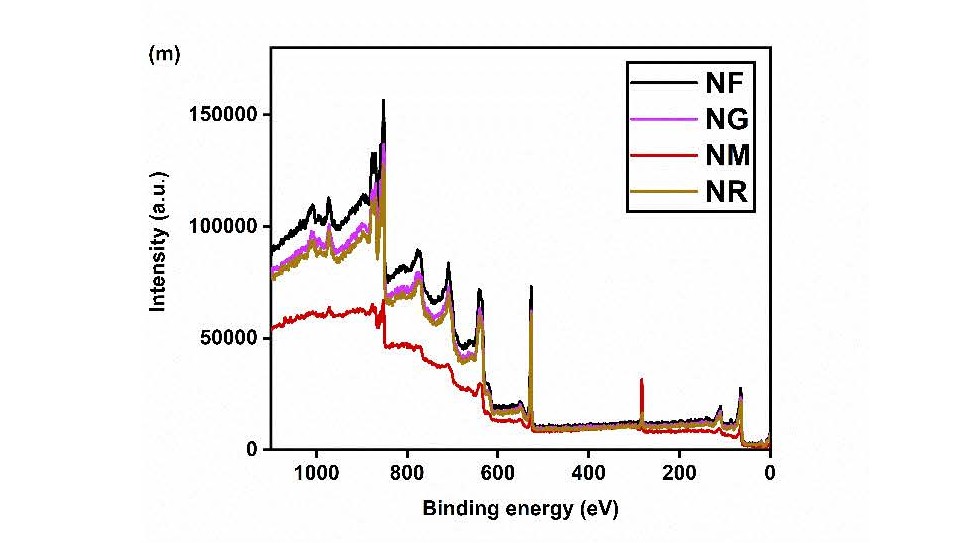 Figure 4. XPS analysis of Ni 2p of (a) NF, (b) NG, (c) NM, and (d) NR, (e) C 1s of NF, (f) NG, (g) NM, and (h) NR, (i) O 1s of NF, (j) NG, (k) NM, (l) NR, and (m) survey spectrum.