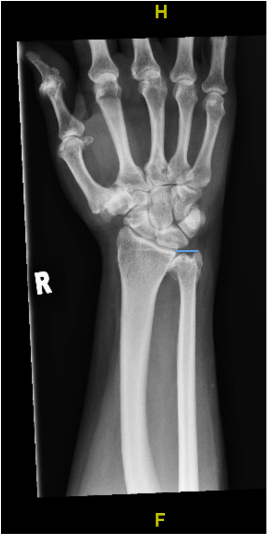 Figure 1. Anteroposterior radiograph of the right wrist, demonstrating negative ulnar variance. The blue horizontal line drawn from the carpal joint surface of the distal radius towards the ulna demonstrates that the distal edge of the ulna is proximal to the distal articular surface of the radius. Mild deformity of the distal ulna may be related to previous unrecalled trauma.