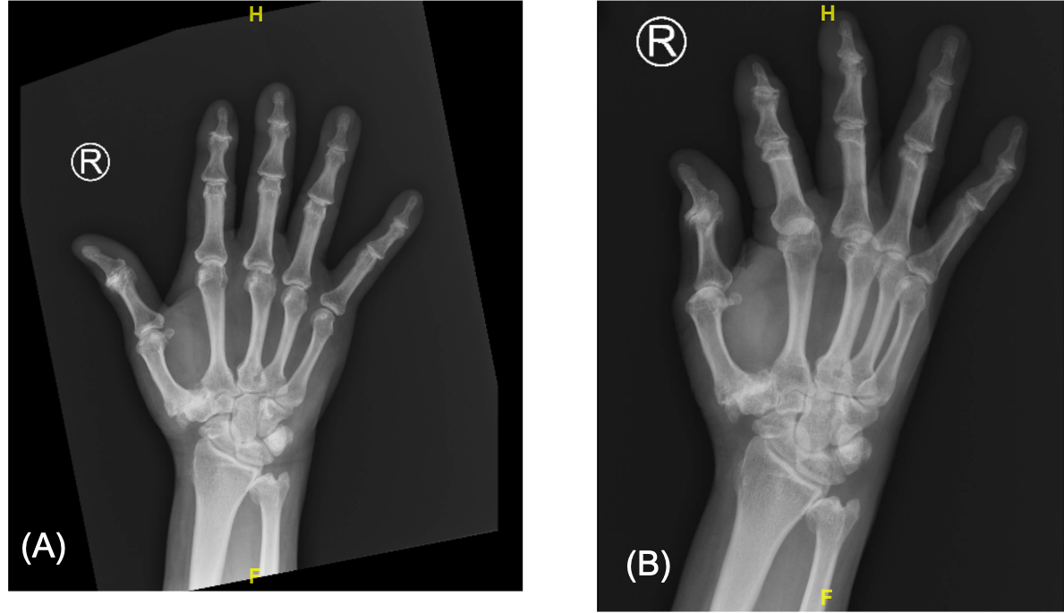 Figure 2. Posteroanterior and oblique radiographs of the right hand demonstrating severe osteoarthritic changes of the DRUJ, with marginal osteophytes, joint-space narrowing, and subchondral sclerosis on either side of the joint. There were also severe osteoarthritic changes visualized in the carpometacarpal and interphalangeal joints of the thumb.