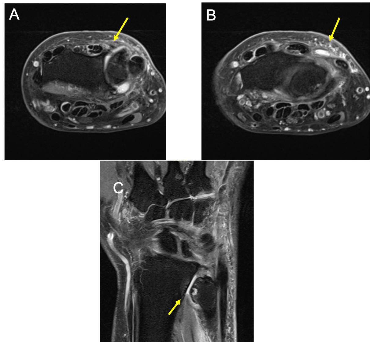 Figure 3. (A) Axial PD fat-saturated MRI sequence at the level of the DRUJ demonstrates prominent dorsal osteophyte causing impingement of the EDM tendon, which is attenuated. (B) More distally, there is complete rupture of the EDM tendon at the level of the proximal carpal row. (C) Coronal PD fat-saturated image demonstrates negative ulnar variance with osteoarthritic changes at the DRUJ, with subchondral cysts and oedema, and small joint effusion.