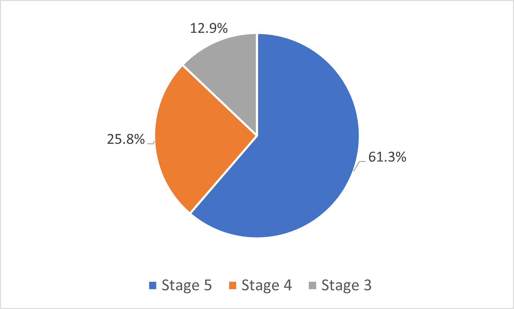 Stages 3, 4 and 5 CKD were found in 12.9%, 25.8%, and 61.3% of the patients, respectively (Figure 1).